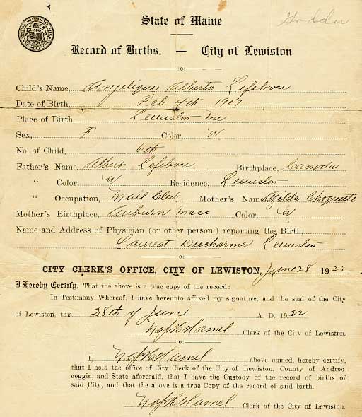 Birth: 25 Oct 1902 7 Clark Street, Lowell, Massachusetts