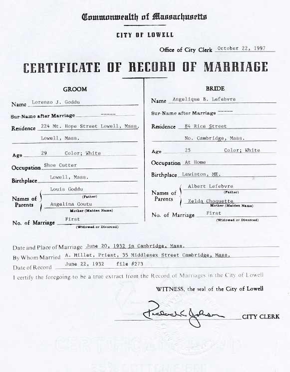 Marriage: 20 Jun 1932 Notre Dame de Pitie's church Cambridge, Massachusetts